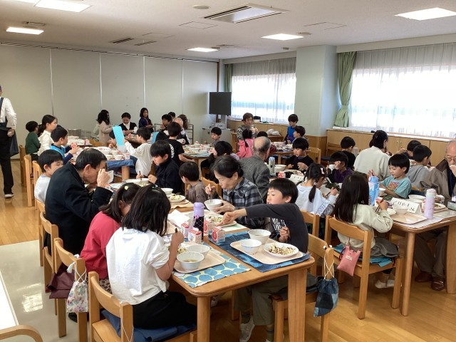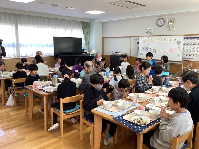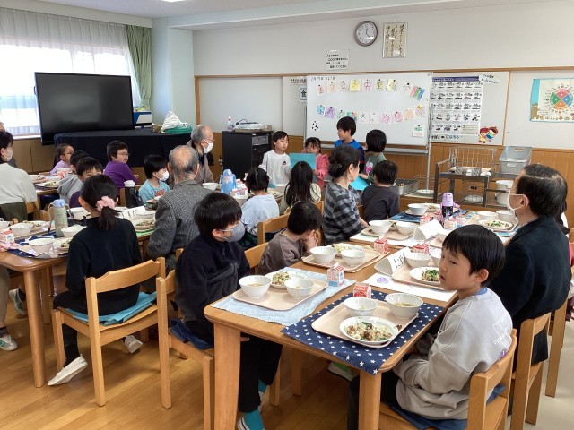 地域の、お年寄りの方々をお招きし、一緒に給食をいただきます。