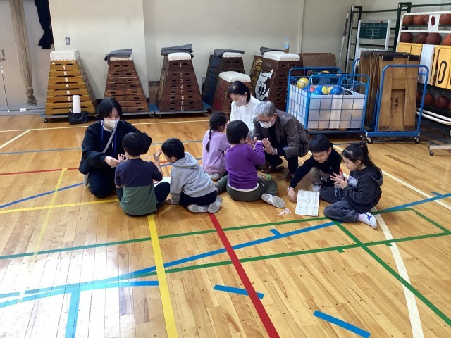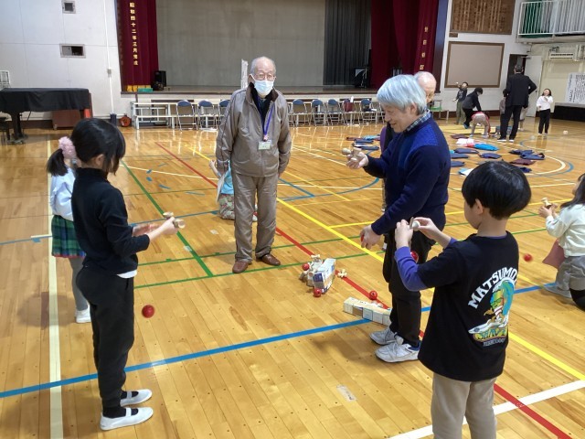 お年寄りの方々に、昔遊びの遊び方を教わっています。