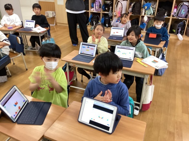三角形で、いろいろなかたちをつくっています。タブレットを使って、色やかたちを選びながら思い思いに新しいかたちをつくっていました。