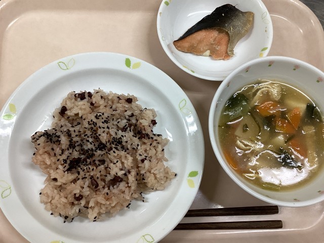お赤飯 鮭の塩焼き 吉野汁 牛乳