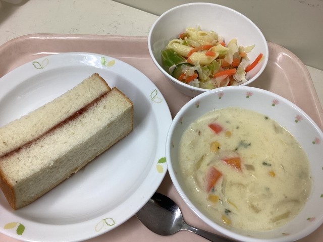 献立 いちごジャムサンド コーンチャウダー マカロニサラダ 牛乳