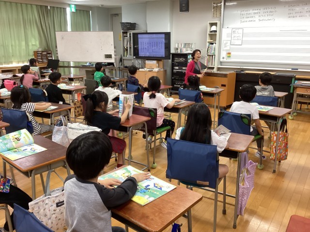 教科書の見開きのページに動物のイラストが出ています。子どもたちは、それらの動物にちなんだ曲を探して、その曲をみんなで歌う活動でした。