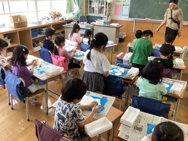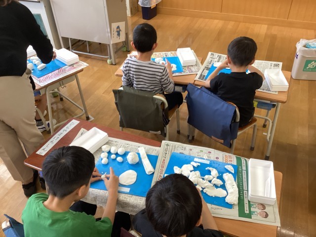 まずは、紙粘土の柔らかな感触を確かめながら、自由に、つくってみたいかたちにチャレンジしていました。