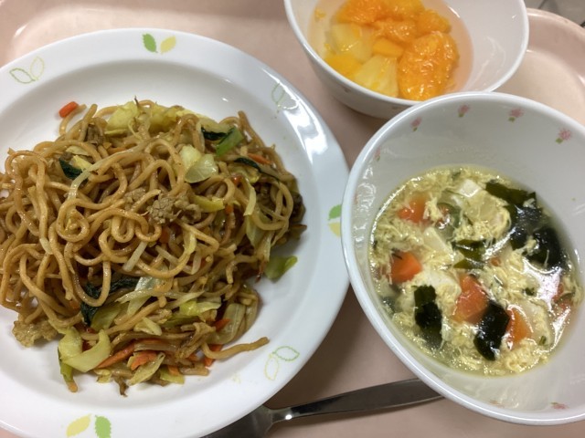 献立 カレー焼きそば 卵とわかめのスープ フルーツポンチ 牛乳