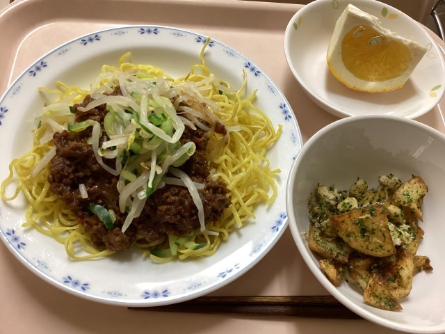 献立 ジャージャー麺 青のりじゃこポテト 樹上完熟甘夏 牛乳