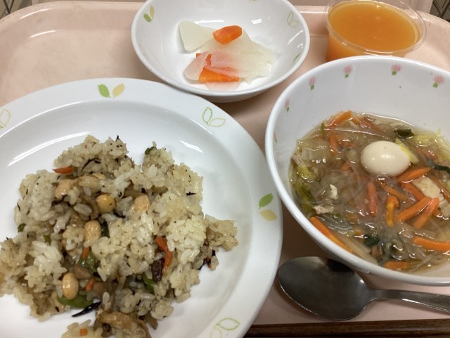 献立 大豆入りひじきごはん 白菜と春雨のスープ 大根とにんじんの甘酢かけ
