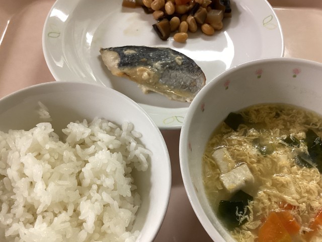 献立 ごはん さわらの西京焼き 五目煮豆 卵とわかめのスープ 牛乳
