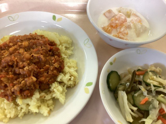 献立 ドライカレーライス 茎わかめのサラダ フルーツヨーグルト 牛乳
