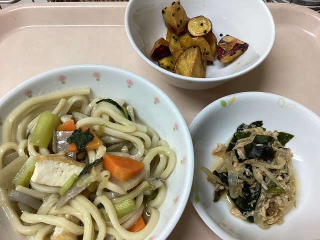 献立 けんちんうどん ツナとわかめのサラダ 大学いも 牛乳