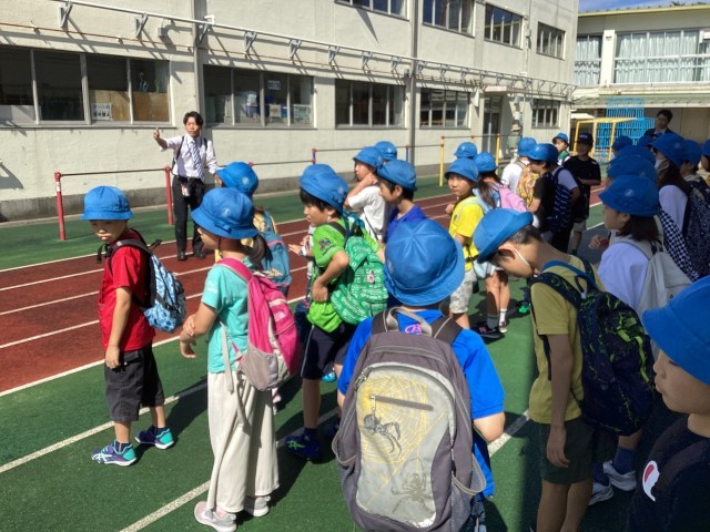 担当の先生から注意事項について説明を受けています。星座早見表を持って出発です。