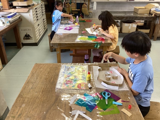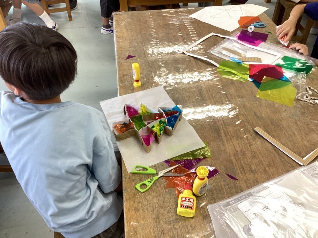 「光サンドウィッチ」思い思いの題材をボール紙で型取り、カラーのセロファンを散りばめていきます。