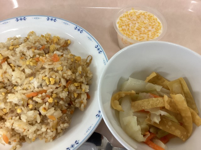 献立 キムチチャーハン あげワンタンのサラダ 牛乳寒天 牛乳