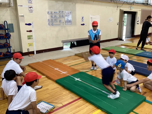 6年生の優しいエスコートで、1年生も体力テストに参加しています。