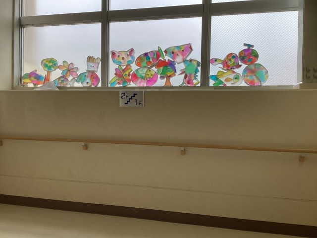 図工「光サンドウィッチ」、完成作品が、夕焼け階段踊り場に展示されています。
