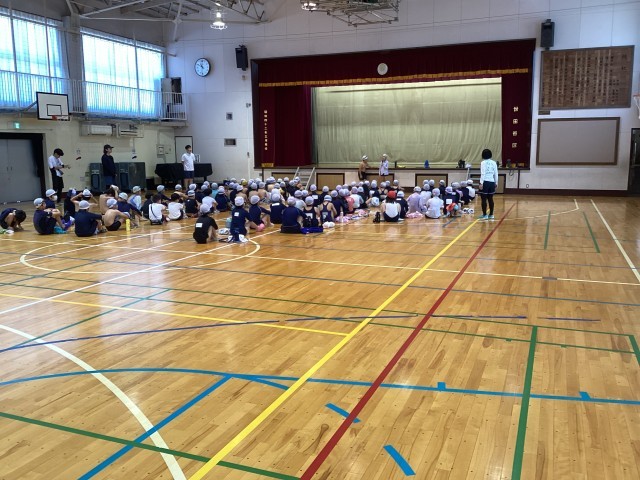 炎天下のプールサイドでの待ち時間を減らすため、プール開きと準備運動は体育館で行いました。