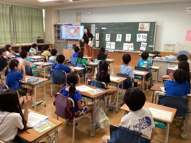 「three」の「th」は、舌を軽く上下の歯に挟んで発音することを、ALTの先生が実演しながら発声していました。