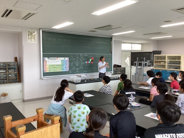 学校近隣にお住まいの、柴田 治呂 様 に、元素周期表に沿って、原子の構造について教わりました。内容的には難しいですが、説明は小学生にもわかりやすいようにお話をしてくださいました。