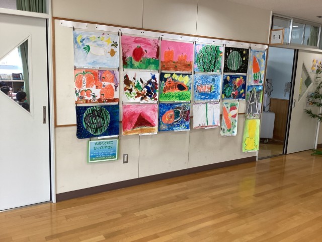 「大きく育て びっくり野菜」のタイトル通り、びっくりするような大きな野菜が、画用紙いっぱいに描かれていました。