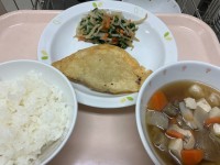 献立 雑穀ごはん サーモンフライ ゆで野菜添え せたがやそだち野菜スープ ...