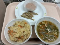 献立 五目ごはん 沢煮椀 わかさぎから揚げ 桜色の蒸しパン 今週1週間は、アーツ...
