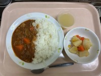 献立 鶏肉のトマト煮 じゃがいもの温サラダ 果肉入りリンゴゼリー 牛乳 今日は2...