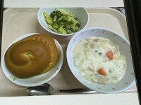献立 あしたばパン クリームシチュー ブロッコリーのサラダ 牛乳 今日は八丈島特...