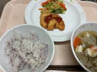献立 雑穀ごはん ぼらのから揚げ 白菜酢のもの 具沢山味噌汁 牛乳 食糧がとぼし...