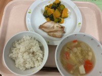 献立 麦入りごはん 鶏肉の照り焼き かぼちゃのサラダ 白菜と豆腐の味噌汁 牛...