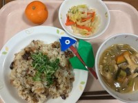 献立 雑穀ごはん ぼらのから揚げ 白菜酢のもの 具沢山味噌汁 牛乳 食糧がとぼし...