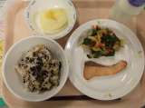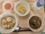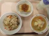 献立 かやくご飯 擬製豆腐 さつま汁 紅白ゼリー 牛乳 米(秋田) にんじん、...