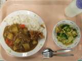 献立 カレーライス 福神漬け ブロッコリーのからしじょうゆ 牛乳 豚肉、にんに...