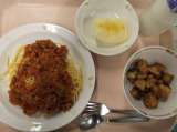 献立 ミートソーススパゲティ 青のりポテト りんご 牛乳 豚肉、にんにく(青森...