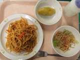 献立 スパゲティナポリタン もやしサラダ スィートポテト 牛乳 豚肉、にんにく...