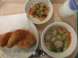 献立 黄粉揚げパン 肉団子と春雨のスープ 野菜のコチジャンダレ 牛乳 しょうが...