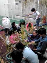 5年生が社会科と環境学習を兼ねて大切に育ててきたバケツ稲が黄金色に実り、収穫のと...
