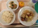 献立 ご飯 ゼリーフライ 野菜のゆかりかけ 大根のべっこう煮 牛乳 ねぎ(秋田...