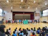 10/23(月)、全校朝会で6年生の壮行会を行いました。 1年生から送られた横断...