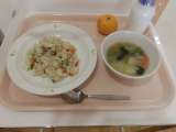 献立 三色ピラフ ビーンズスース みかん 牛乳 米 秋田 にんじん...