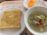 献立 セサミトースト じゃがいもとソーセージのスープ 柿 牛乳 キャベツ...