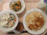 献立 わかめご飯 青森おでん 野菜のごま酢あえ 牛乳 米(秋田) 卵(岩手) ...
