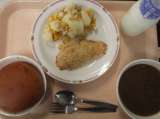 献立 黒砂糖パン 鮭のアイヨリソースパン粉焼き リヨネーズポテト オニオンスープ...