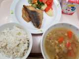 献立 ごまごはん メルの甘辛みそ煮 マセドアンサラダ 野菜スー...