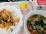 献立 キムチ丼 ワンタンスープ キャロット蒸しパン 牛乳 こ...
