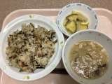 献立 豆入りひじきごはん しこね汁(群馬県郷土料理) りんごとサツマ...