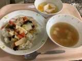献立 中華丼 茎わかめのスープ 杏仁豆腐 牛乳 今日は具沢...