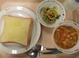 献立 ガーリックトースト ポークビーンズ みそドレサラダ 牛乳 豚肉、にんにく...