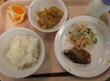 献立 ごはん さばのピリ辛焼き じゃが芋の甘辛煮 かみかみ塩ナムル 牛乳 米(...