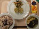 献立 お赤飯 菜の花蒸し 胡麻和え 澄まし汁 オレンジジュース 米(秋田) 餅...