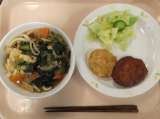 献立 わかめうどん おびてん じゃが芋の天ぷら ひとしおやさい 牛乳 飛び魚(...