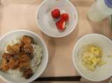 献立 しいらの揚げ煮丼 白菜のサラダ くだもの 牛乳 米(秋田) しいら(石川...